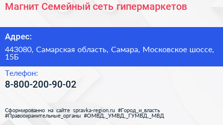 Магнит Семейный, сеть гипермаркетов по адресу 443080, Самарская область, Самара, Московское шоссе, 15Б в дальнейшем Организация, размещена в следующих категориях: