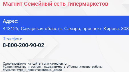 Магнит Семейный, сеть гипермаркетов по адресу 443125, Самарская область, Самара, проспект Кирова, 308 в дальнейшем Организация, размещена в следующих категориях: