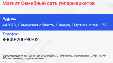 Магнит Семейный, сеть гипермаркетов по адресу 443070, Самарская область, Самара, Партизанская, 17Б в дальнейшем Организация, размещена в следующих категориях: