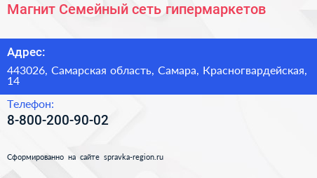 Магнит Семейный, сеть гипермаркетов по адресу 443026, Самарская область, Самара, Красногвардейская, 14 в дальнейшем Организация, размещена в следующих категориях: