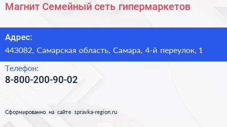 Магнит Семейный, сеть гипермаркетов по адресу 443082, Самарская область, Самара, 4-й переулок, 1 в дальнейшем Организация, размещена в следующих категориях: