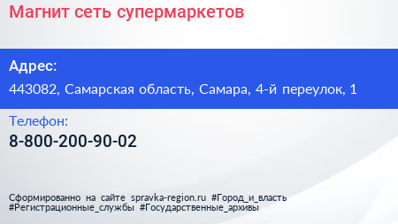 Магнит, сеть супермаркетов по адресу 443082, Самарская область, Самара, 4-й переулок, 1 в дальнейшем Организация, размещена в следующих категориях: