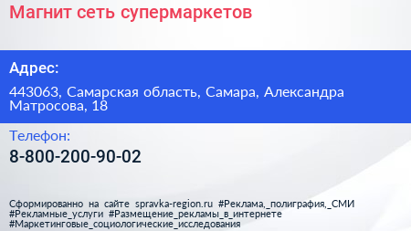 Магнит, сеть супермаркетов по адресу 443063, Самарская область, Самара, Александра Матросова, 18 в дальнейшем Организация, размещена в следующих категориях: