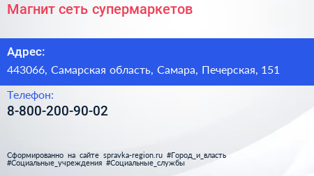 Магнит, сеть супермаркетов по адресу 443066, Самарская область, Самара, Печерская, 151 в дальнейшем Организация, размещена в следующих категориях:
