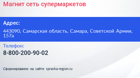 Магнит, сеть супермаркетов по адресу 443090, Самарская область, Самара, Советской Армии, 157а в дальнейшем Организация, размещена в следующих категориях: