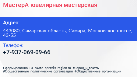МастерА, ювелирная мастерская по адресу 443080, Самарская область, Самара, Московское шоссе, 43-55 в дальнейшем Организация, размещена в следующих категориях:
