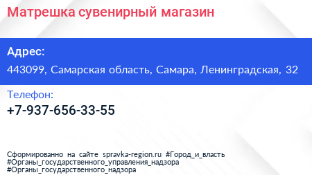 Матрешка, сувенирный магазин по адресу 443099, Самарская область, Самара, Ленинградская, 32 в дальнейшем Организация, размещена в следующих категориях: