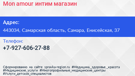 Mon-amour, интим-магазин по адресу 443034, Самарская область, Самара, Енисейская, 37 в дальнейшем Организация, размещена в следующих категориях: