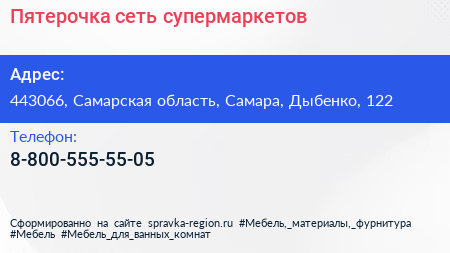 Пятерочка, сеть супермаркетов по адресу 443066, Самарская область, Самара, Дыбенко, 122 в дальнейшем Организация, размещена в следующих категориях: