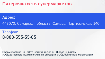 Пятерочка, сеть супермаркетов по адресу 443070, Самарская область, Самара, Партизанская, 140 в дальнейшем Организация, размещена в следующих категориях: