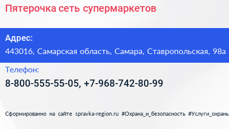 Пятерочка, сеть супермаркетов по адресу 443016, Самарская область, Самара, Ставропольская, 98а в дальнейшем Организация, размещена в следующих категориях: