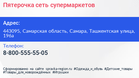 Пятерочка, сеть супермаркетов по адресу 443095, Самарская область, Самара, Ташкентская улица, 196а в дальнейшем Организация, размещена в следующих категориях: