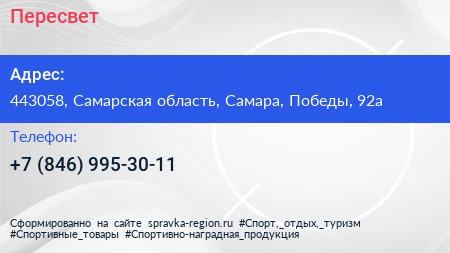 Пересвет по адресу 443058, Самарская область, Самара, Победы, 92а в дальнейшем Организация, размещена в следующих категориях: