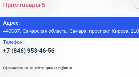 Промтовары 5 по адресу 443087, Самарская область, Самара, проспект Кирова, 210 в дальнейшем Организация, размещена в следующих категориях: