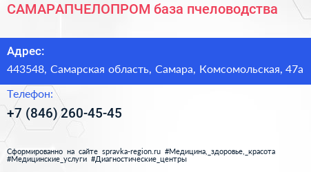 САМАРАПЧЕЛОПРОМ, база пчеловодства по адресу 443548, Самарская область, Самара, Комсомольская, 47а в дальнейшем Организация, размещена в следующих категориях:
