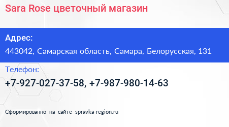 Sara Rose, цветочный магазин по адресу 443042, Самарская область, Самара, Белорусская, 131 в дальнейшем Организация, размещена в следующих категориях: