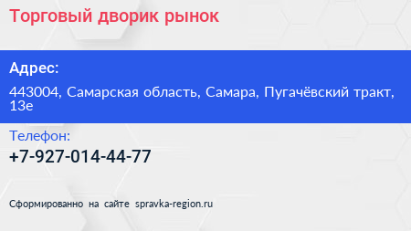 Торговый дворик, рынок по адресу 443004, Самарская область, Самара, Пугачёвский тракт, 13е в дальнейшем Организация, размещена в следующих категориях: