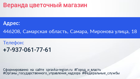 Веранда, цветочный магазин по адресу 446208, Самарская область, Самара, Миронова улица, 18 в дальнейшем Организация, размещена в следующих категориях: