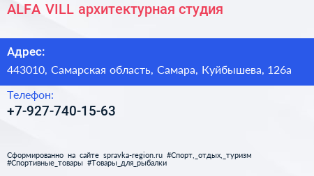 ALFA-VILL, архитектурная студия по адресу 443010, Самарская область, Самара, Куйбышева, 126а в дальнейшем Организация, размещена в следующих категориях: