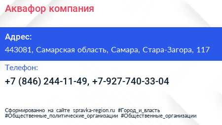 Аквафор, компания по адресу 443081, Самарская область, Самара, Стара-Загора, 117 в дальнейшем Организация, размещена в следующих категориях: