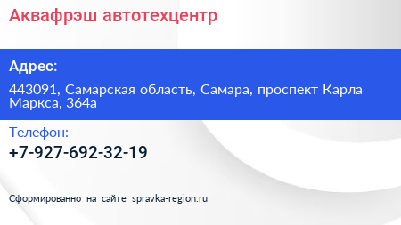 Аквафрэш, автотехцентр по адресу 443091, Самарская область, Самара, проспект Карла Маркса, 364а в дальнейшем Организация, размещена в следующих категориях: