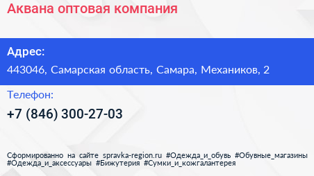 Аквана, оптовая компания по адресу 443046, Самарская область, Самара, Механиков, 2 в дальнейшем Организация, размещена в следующих категориях: