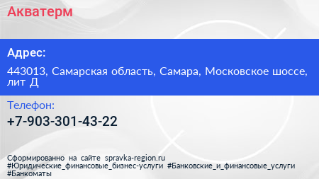 Акватерм по адресу 443013, Самарская область, Самара, Московское шоссе, лит Д в дальнейшем Организация, размещена в следующих категориях: