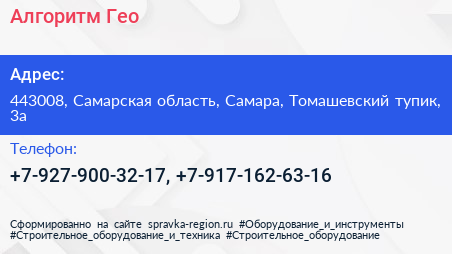 Алгоритм Гео по адресу 443008, Самарская область, Самара, Томашевский тупик, 3а в дальнейшем Организация, размещена в следующих категориях: