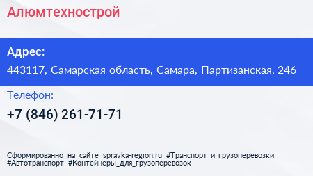 Алюмтехнострой по адресу 443117, Самарская область, Самара, Партизанская, 246 в дальнейшем Организация, размещена в следующих категориях: