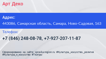 Арт-Деко по адресу 443086, Самарская область, Самара, Ново-Садовая, 163 в дальнейшем Организация, размещена в следующих категориях: