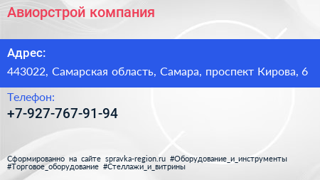 Авиорстрой, компания по адресу 443022, Самарская область, Самара, проспект Кирова, 6 в дальнейшем Организация, размещена в следующих категориях: