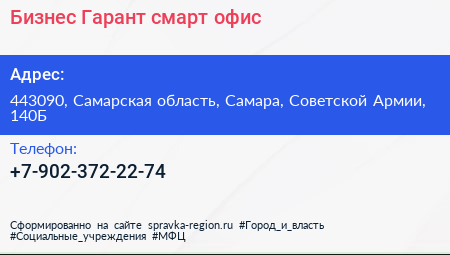 Бизнес-Гарант, смарт-офис по адресу 443090, Самарская область, Самара, Советской Армии, 140Б в дальнейшем Организация, размещена в следующих категориях: