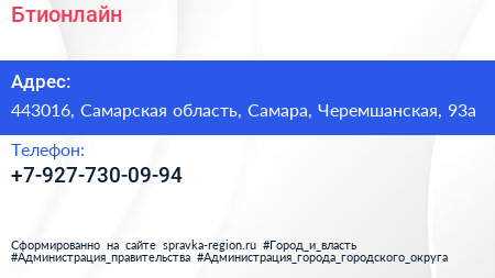Бтионлайн по адресу 443016, Самарская область, Самара, Черемшанская, 93а в дальнейшем Организация, размещена в следующих категориях: