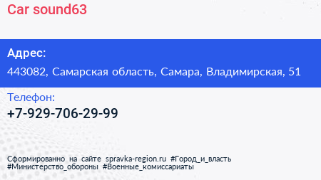 Car-sound63 по адресу 443082, Самарская область, Самара, Владимирская, 51 в дальнейшем Организация, размещена в следующих категориях: