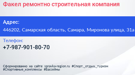 Факел, ремонтно-строительная компания по адресу 446202, Самарская область, Самара, Миронова улица, 31а в дальнейшем Организация, размещена в следующих категориях: