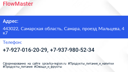 FlowMaster по адресу 443022, Самарская область, Самара, проезд Мальцева, 4 к7 в дальнейшем Организация, размещена в следующих категориях: