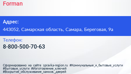Forman по адресу 443052, Самарская область, Самара, Береговая, 9а в дальнейшем Организация, размещена в следующих категориях: