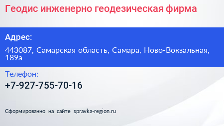Геодис, инженерно-геодезическая фирма по адресу 443087, Самарская область, Самара, Ново-Вокзальная, 189а в дальнейшем Организация, размещена в следующих категориях: