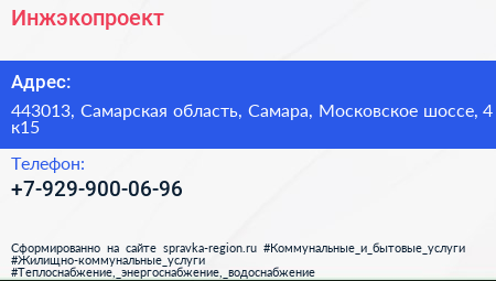 Инжэкопроект по адресу 443013, Самарская область, Самара, Московское шоссе, 4 к15 в дальнейшем Организация, размещена в следующих категориях:
