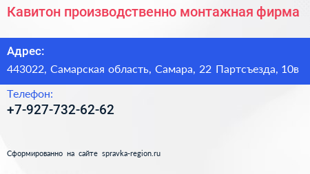 Кавитон, производственно-монтажная фирма по адресу 443022, Самарская область, Самара, 22 Партсъезда, 10в в дальнейшем Организация, размещена в следующих категориях: