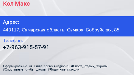 Кол-Макс по адресу 443117, Самарская область, Самара, Бобруйская, 85 в дальнейшем Организация, размещена в следующих категориях: