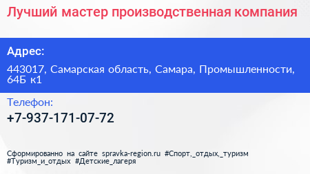 Лучший мастер, производственная компания по адресу 443017, Самарская область, Самара, Промышленности, 64Б к1 в дальнейшем Организация, размещена в следующих категориях: