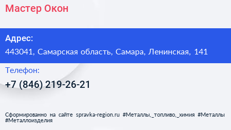 Мастер Окон по адресу 443041, Самарская область, Самара, Ленинская, 141 в дальнейшем Организация, размещена в следующих категориях: