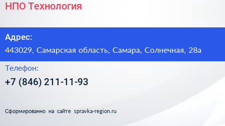 НПО Технология по адресу 443029, Самарская область, Самара, Солнечная, 28а в дальнейшем Организация, размещена в следующих категориях: