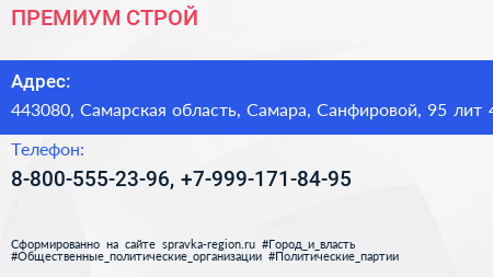 ПРЕМИУМ СТРОЙ по адресу 443080, Самарская область, Самара, Санфировой, 95 лит 4 в дальнейшем Организация, размещена в следующих категориях: