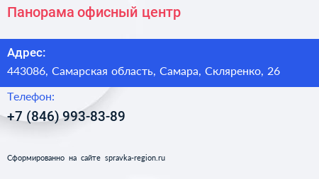 Панорама, офисный центр по адресу 443086, Самарская область, Самара, Скляренко, 26 в дальнейшем Организация, размещена в следующих категориях: