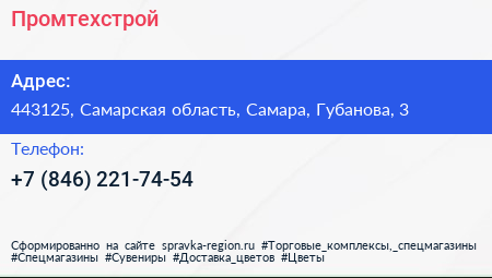 Промтехстрой по адресу 443125, Самарская область, Самара, Губанова, 3 в дальнейшем Организация, размещена в следующих категориях: