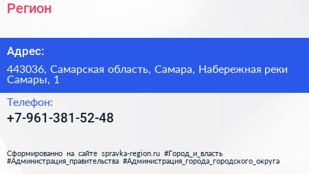 Регион по адресу 443036, Самарская область, Самара, Набережная реки Самары, 1 в дальнейшем Организация, размещена в следующих категориях: