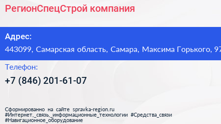 РегионСпецСтрой, компания по адресу 443099, Самарская область, Самара, Максима Горького, 97 в дальнейшем Организация, размещена в следующих категориях: