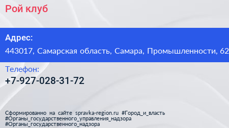 Рой, клуб по адресу 443017, Самарская область, Самара, Промышленности, 62 в дальнейшем Организация, размещена в следующих категориях: